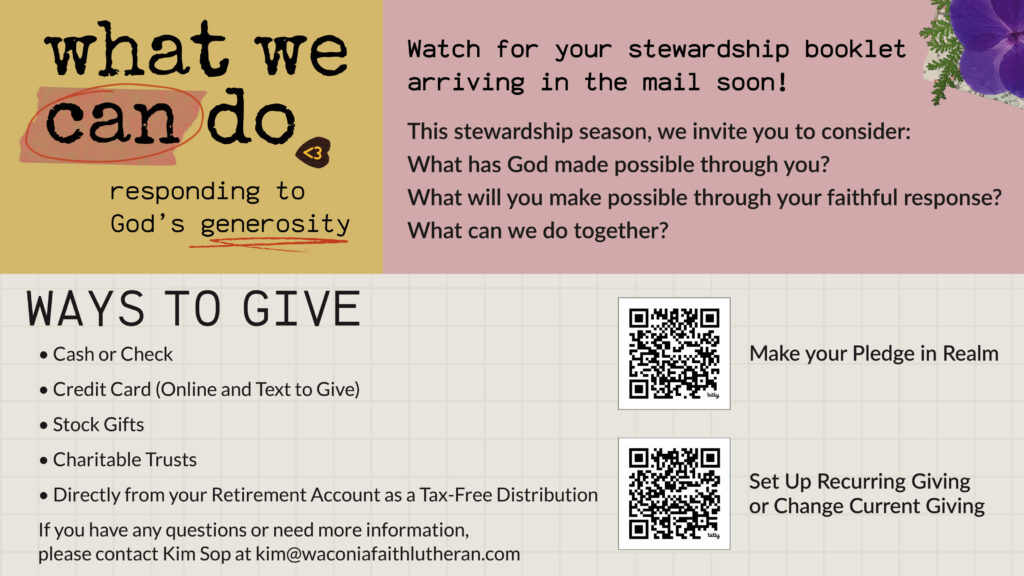 Contributions can be made directly from your checking or savings account, as well as credit and debit cards. You can make a one-time donation, or set up your own recurring payment plan. By following the steps at the top of the page you can set up online giving through Realm. If you’d like us to set up your electronic contributions, please contact the church office at 952-442-2101.