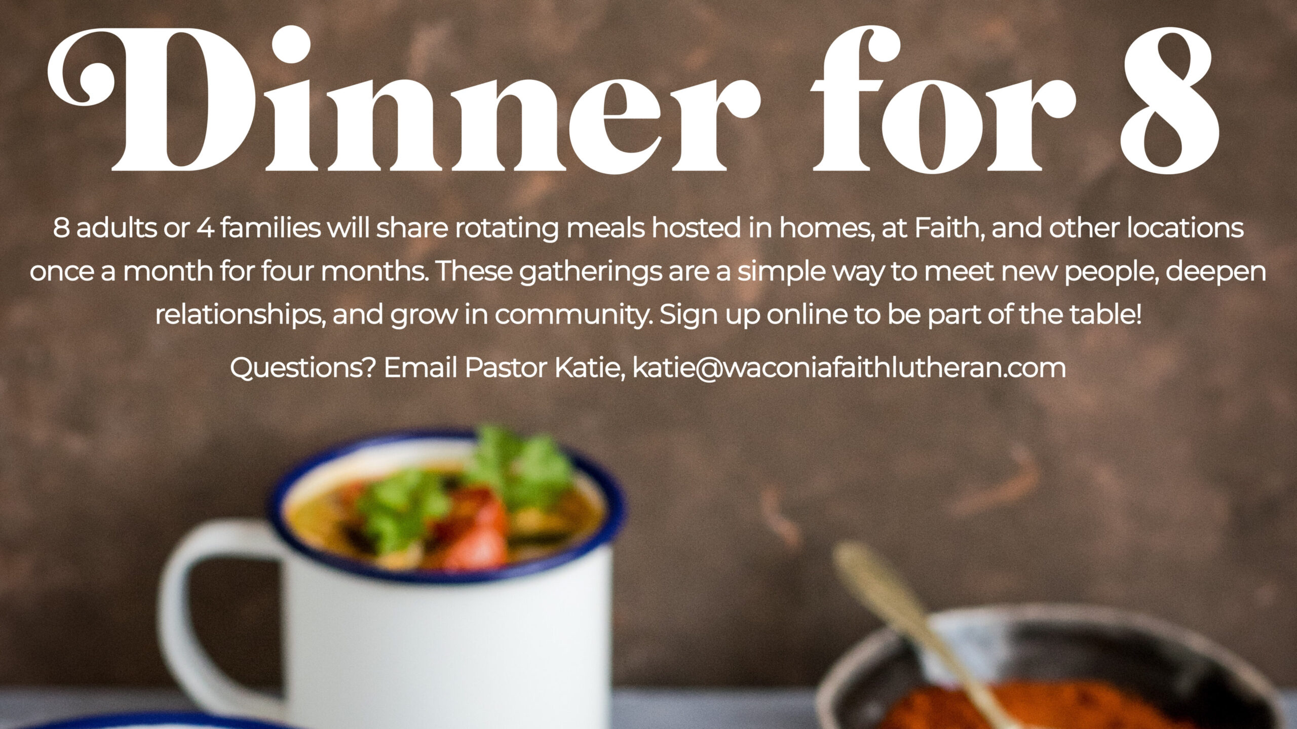 8 adults or 4 families will share rotating meals hosted in homes, at Faith, and other locations once a month for four months. These gatherings are a simple way to meet new people, deepen relationships, and grow in community. Sign up below to be part of the table!